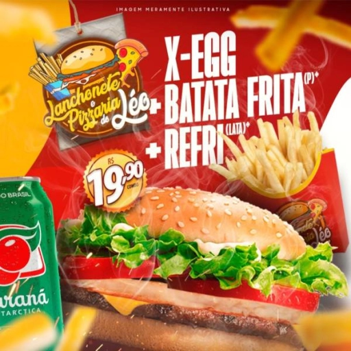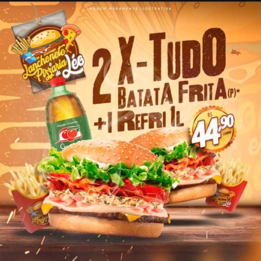 1 X-Léo (Pão, 2 carnes, ovo, queijo, presunto, bacon, frango, cheddar e alface) + Batata Frita P + Coca Cola Lata