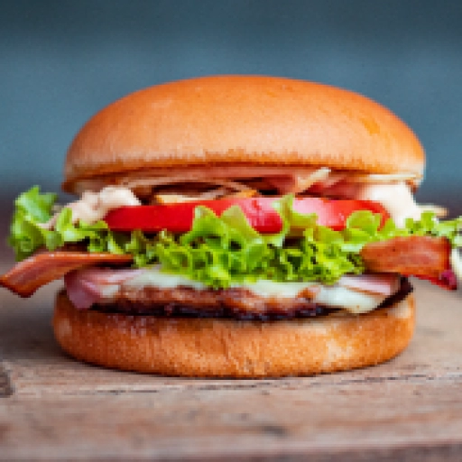 Pão, 2 hambúrgueres, 2 queijos, 2 presuntos, bacon, frango desfiado, cheddar e alface