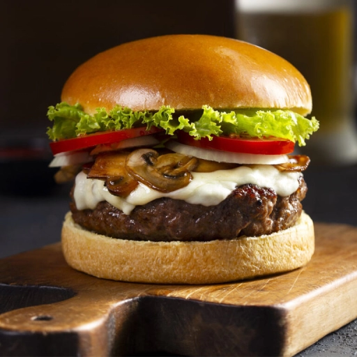 Pão brioche, 01 carne sabor picanha 90g, 2 fatias de mussarela, alface e tomate